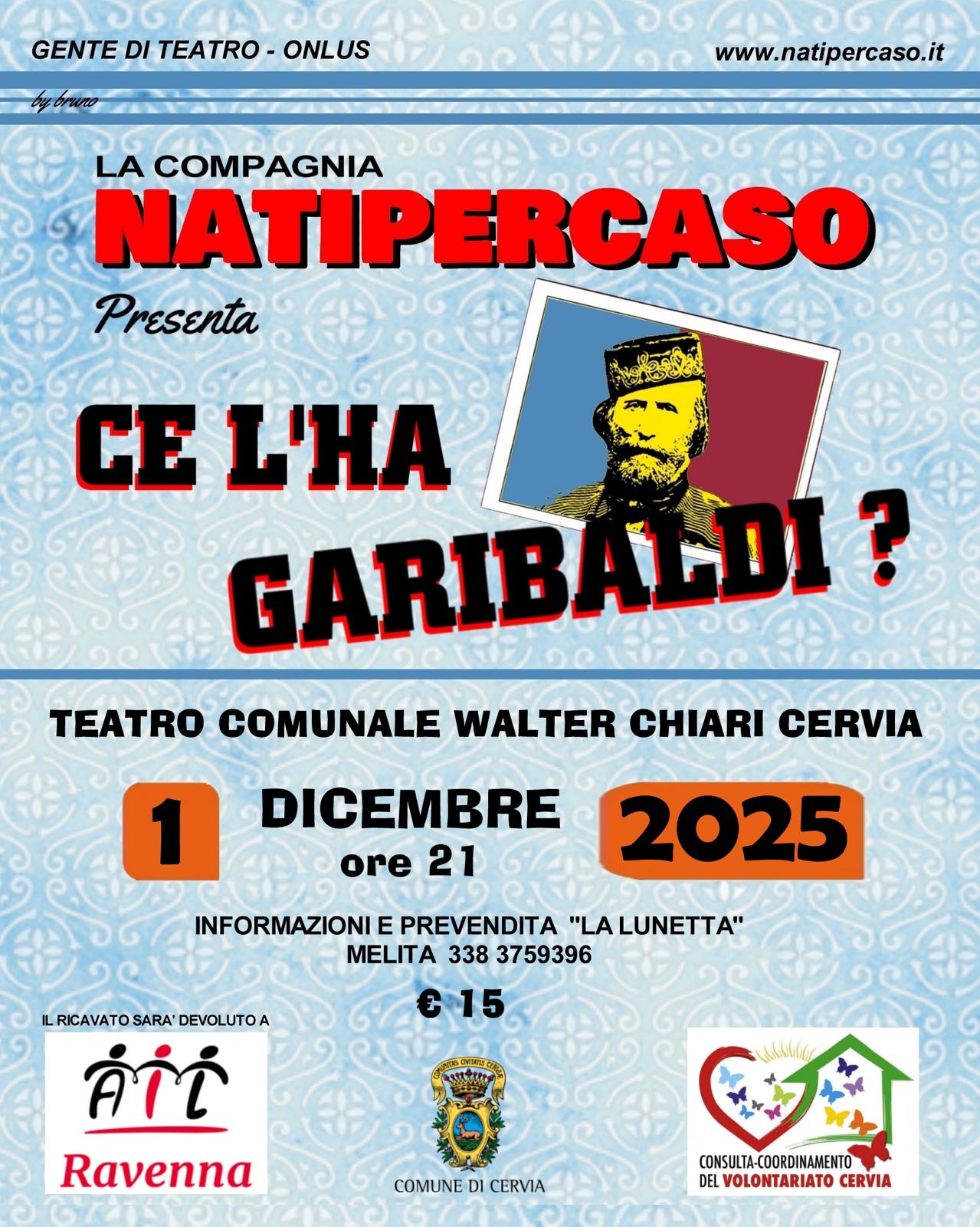 Lunedì 1 Dicembre alle 21- Teatro Walter Chiari Cervia La compagnia “Nati per Caso” metterà in scena lo spettacolo "Ce l'ha Garibaldi?" I biglietti saranno distribuiti in prevendita al costo